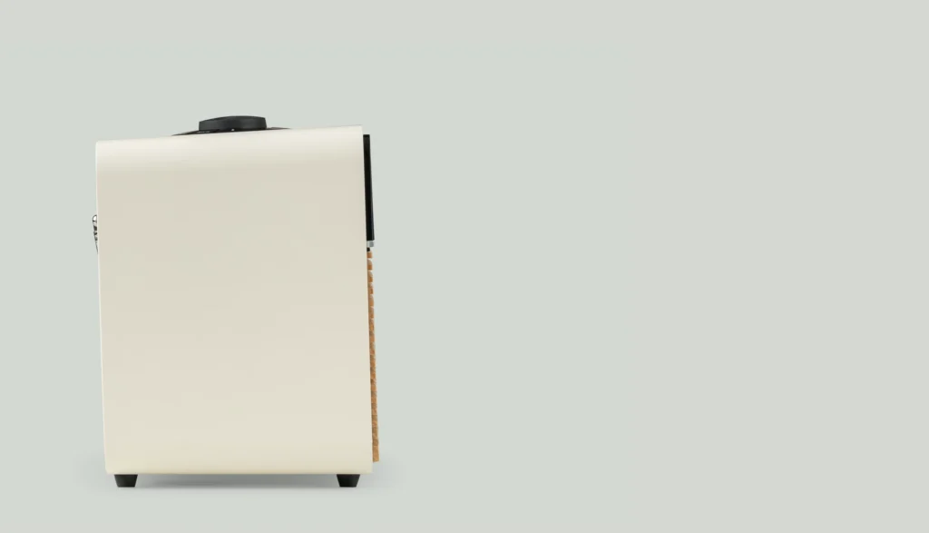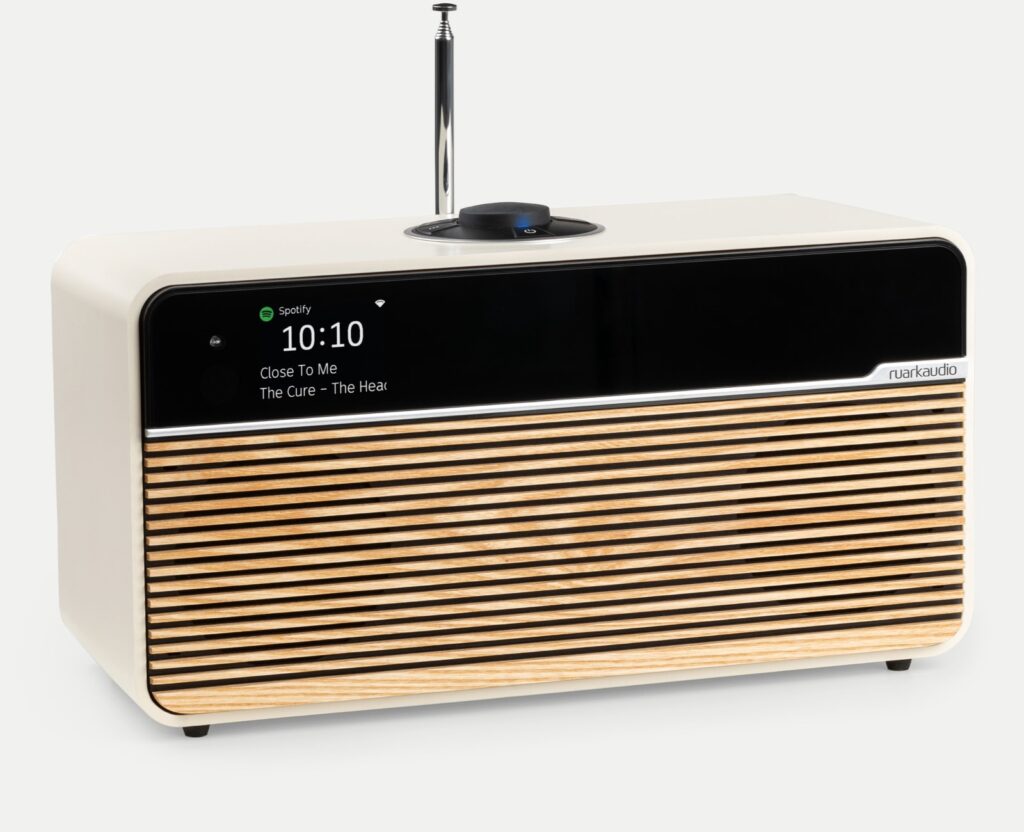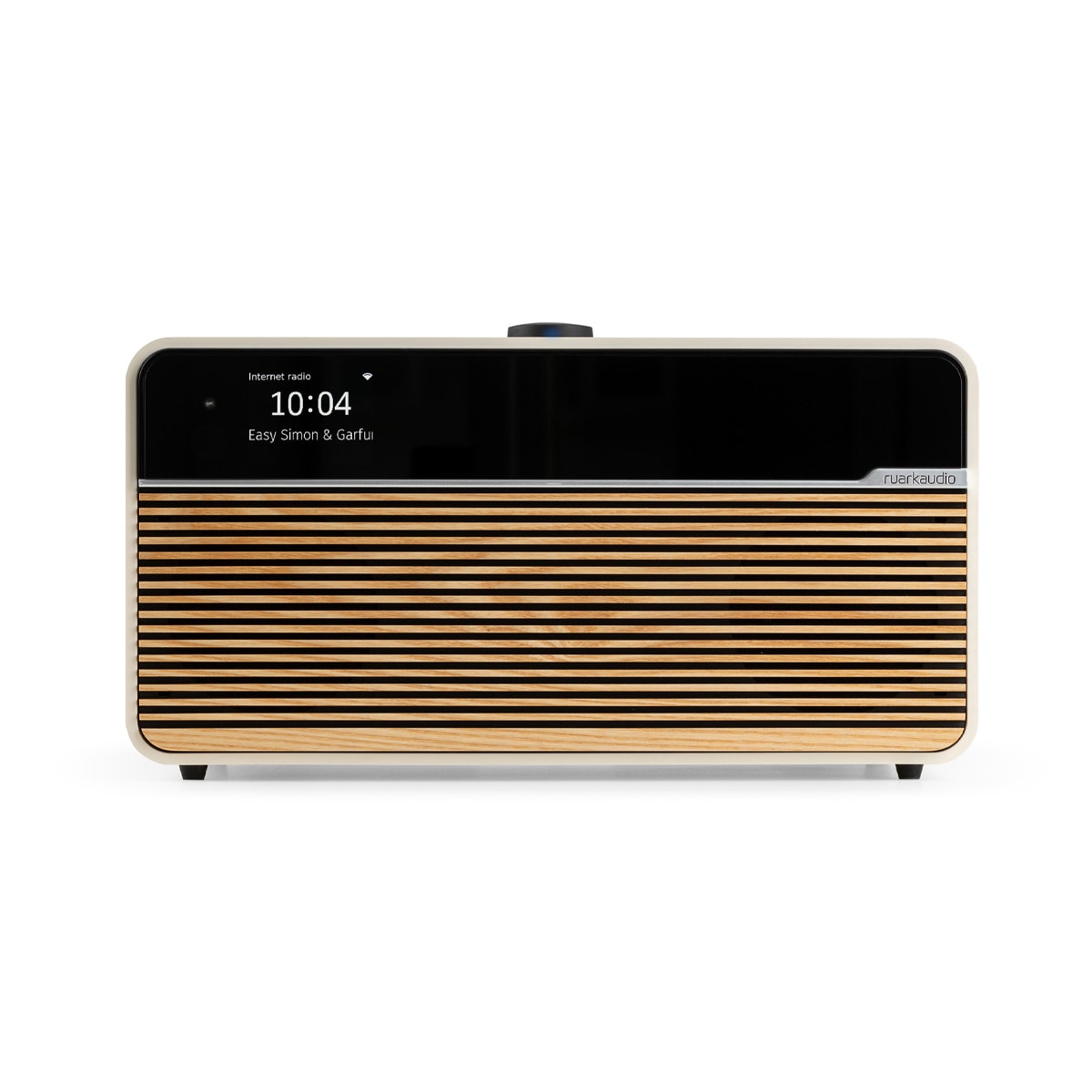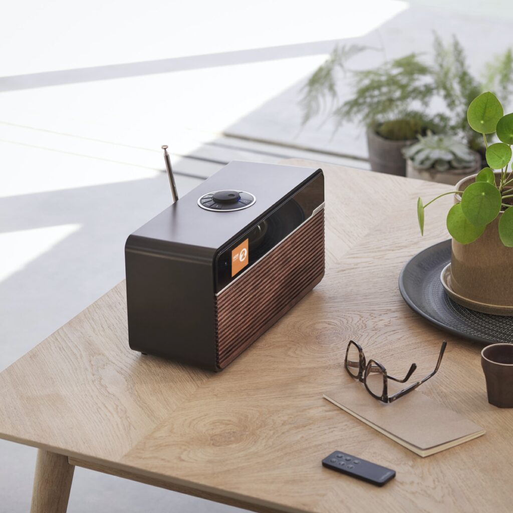 Designet kombinerer stramme linjer og myke kurver med en håndlaget front i trelameller – et retro-moderne uttrykk som både er tidløst og elegant. Skjermen i herdet glass og vår karakteristiske RotoDial-kontroller gjør det umiskjennelig Ruark.