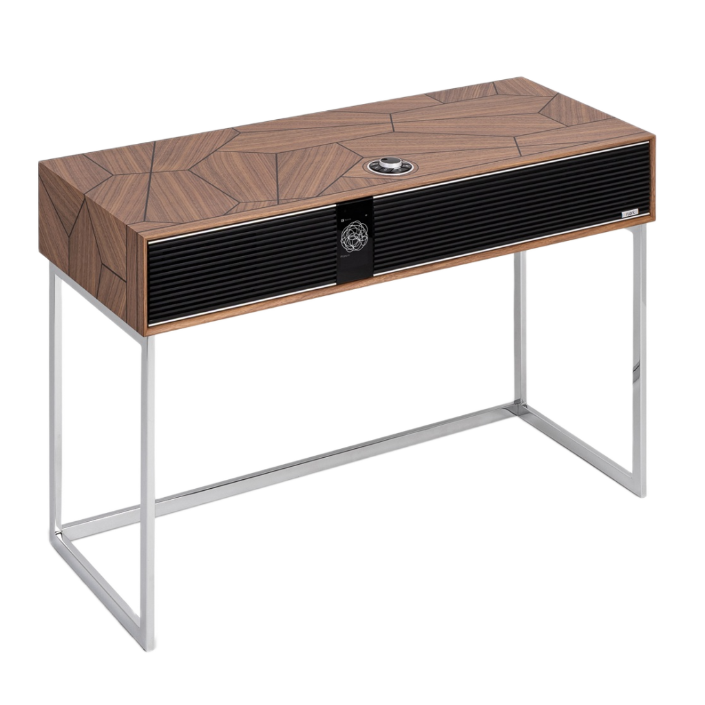 Hvert kabinett er unikt og basert på en århundregammel håndverks teknikk. Nøye utvalgte finér-stykker skjæres og settes sammen for hånd før de limes til R810-kabinettet. Perfekt justering planlegges i detalj, og etter herding påføres flere lag lakk. Mellom hvert lag håndslipes overflaten for å oppnå en dybde og glans som kun tid og ekte håndverk kan gi.